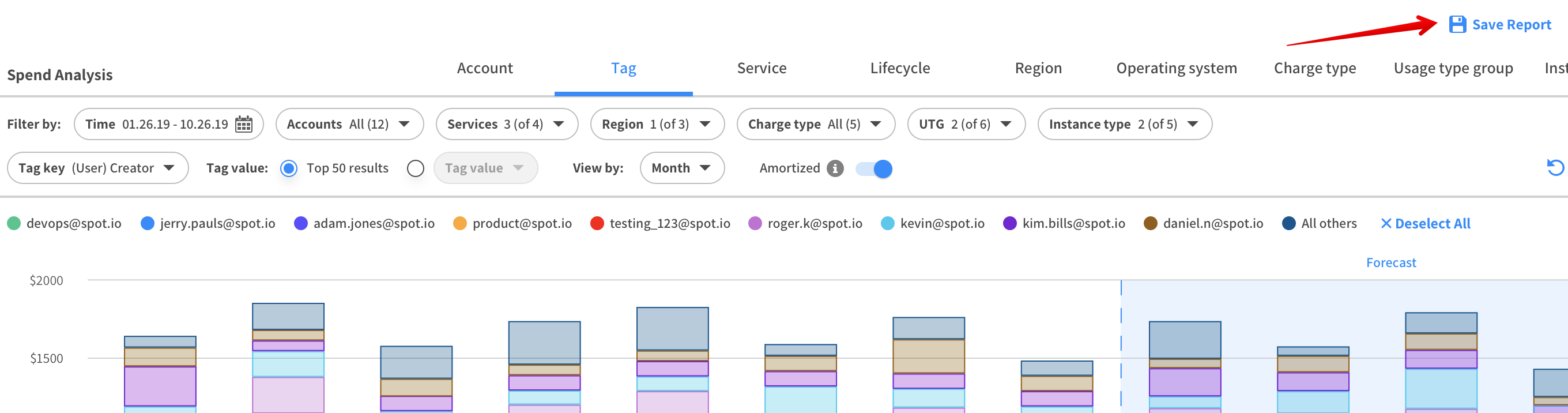 The Cloud Analyzer Cost Analysis page provides a detailed breakdown of your organization's cloud compute costs. When you create customized Spend Analysis reports using the filters and grouping options, you can save each report for quick reference and future follow up on spending. By saving your customized reports, you can re-use the same filters and grouping options without having to reset them each time you need a report. This saves time for you and helps you to obtain exactly the same report parameters and presentation whenever you review reports.